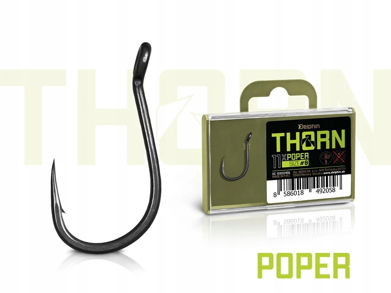 Thorn Poper to specyficzny haczyk przez wygięte na zewnątrz oczko. Taka konstrukcja predestynuje go przede wszystkim do stosowania z przynętami typu pop-up. Doskonale nadaje się do tworzenia zestawów, takich jak Chod rig, Multi rig, Zig rig i tym podobne. Dzięki lekkiej wewnętrznej krzywiźnie idealnie wpasowuje się w pysk karpia po uderzeniu.