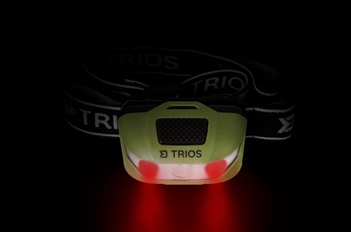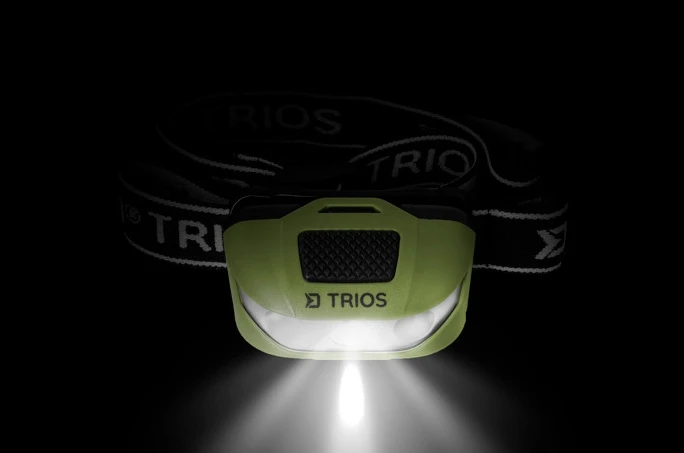 TRIOS to podstawowy typ lampy czołowej, która jest atrakcyjna nie tylko ze względu na cenę. Jest wyposażona w trzy diody LED, zabudowane w zielonym korpusie. Regulowany kąt nachylenia pozwala na oświetlenie zestawu końcowego, albo książki podczas wyprawy pod namioty. Korpus lampy znajduje się na elastycznym pasku z logo Delphin i TRIOS. Włącznik znajduje się w górnej części czołówki. Lampa ma trzy tryby świecenia: Przycisk przyciśnięty raz uruchamia lampę na 70% (działa 5 godzin), drugi raz na 100%(działa 3,5 godziny), trzeci raz na 30% (działa 12 godzin). Przytrzymanie przycisku, aktywuje czerwone diody boczne, które mogą zapalić się, migać lub emitować sygnał SOS.