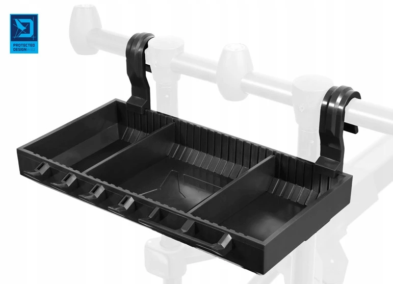ShelfPOD ma podniesione krawędzie, aby utrzymać sprzęt w bezpiecznym miejscu. Dno jest perforowane, aby odprowadzać nadmiar wody podczas deszczu. Dwa mocne plastikowe haczyki pozwalają łatwo zawiesić półkę na uchwycie, a ponieważ można je odłączyć, można przenieść półkę do namiotu lub umieścić ją na stole.