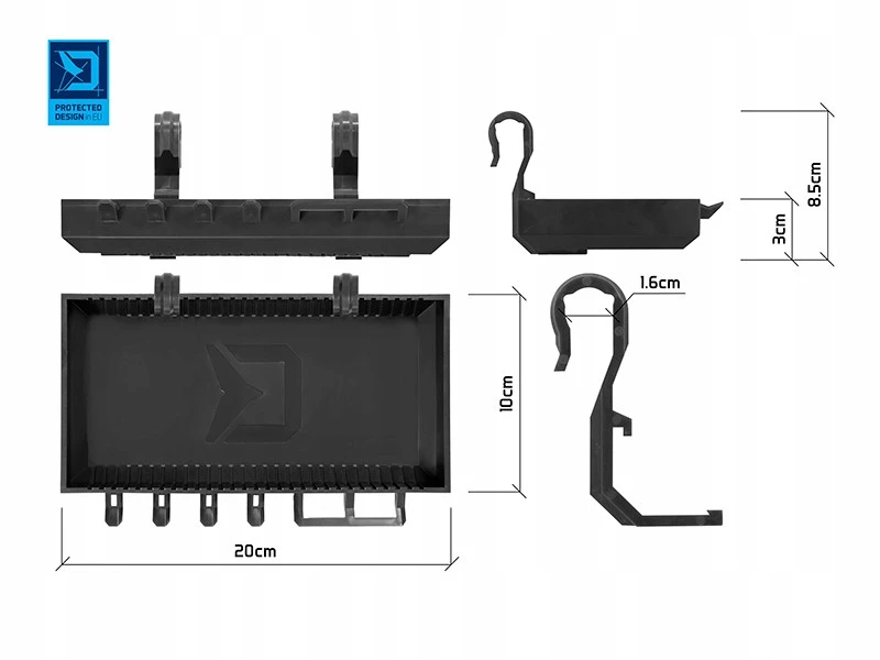 Z przodu znajdują się również haczyki do zawieszenia sprzętu. Mogą być używane do igieł, nożyczek lub innych małych elementów. Wyjmowane przegrody pozwalają zoptymalizować przestrzeń do przechowywania w zależności od potrzeb. Półka została zaprojektowana w ulubionym czarnym wzorze BlackWAY.