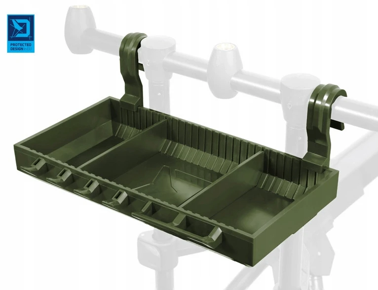 ShelfPOD ma podniesione krawędzie, aby utrzymać sprzęt w bezpiecznym miejscu. Dno jest perforowane, aby odprowadzać nadmiar wody podczas deszczu. Dwa mocne plastikowe haczyki pozwalają łatwo zawiesić półkę na uchwycie, a ponieważ można je odłączyć, można przenieść półkę do namiotu lub umieścić ją na stole.