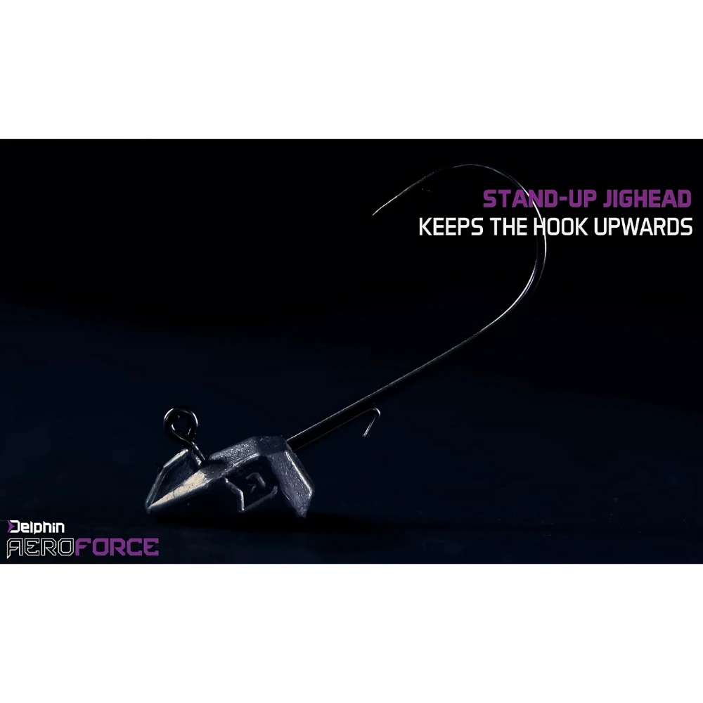 Delphin Aeroforce to główka jigowa zaprojektowana w specjalnym kształcie do łowienia miękkimi przynętami blisko dna. Dolna część główki jest płaska, a środek ciężkości znajduje się znacznie niżej niż w konwencjonalnych okrągłych jigach. W ten sposób hak i przynęta zawsze pozostają w pozycji podniesionej, co zmniejsza ryzyko utknięcia w zaczepach i poprawia ogólną prezentację przynęty, która pozostaje na dnie. Ze względu na swój aerodynamiczny kształt z łatwością pokonuje podwodne przeszkody i płynniej porusza się w wodzie. Zamiast kołnierza jigowego zastosowano tu zaczep, który utrzymuje przynętę na miejscu i nie uszkadza jej poprzez rozciąganie. Ponadto ma cienki , mocny i ostry hak.